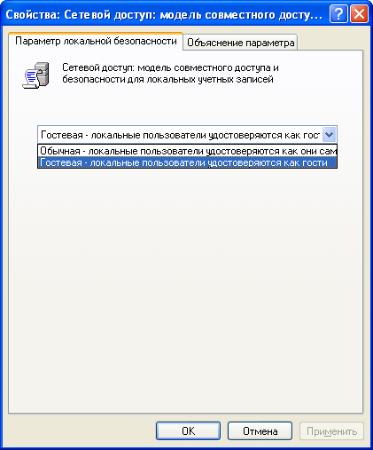 как состоит весь механизм. Предположим вы хотите на компьютере comp01 расшарить папку для comp02 или скажем для всех. Перво наперво вам нужно проверить систему аунтификации клиента по протоколу SMB, проще говоря, как comp01 будет рассматривать всех входящих. для этого лезим в ПУСК(START) -=> Панель управления(CONTROL PANEL) -=>Администрирование(Administrative Tools)-=>локальные параметры безопасности(local security settings)-=>локальные политики(Local policies)-=>параметры безопасности(security options) там нужно будет найти строку "сетевой доступ:модель совместного доступа и безопасности для локальных учётных записей"(NETWORK ACCESS:sharing and security model for local accounts) в этой строке можно указывать как будет воспринимать ваш комьютер входящих. первый это (classic) второй (Guest only)